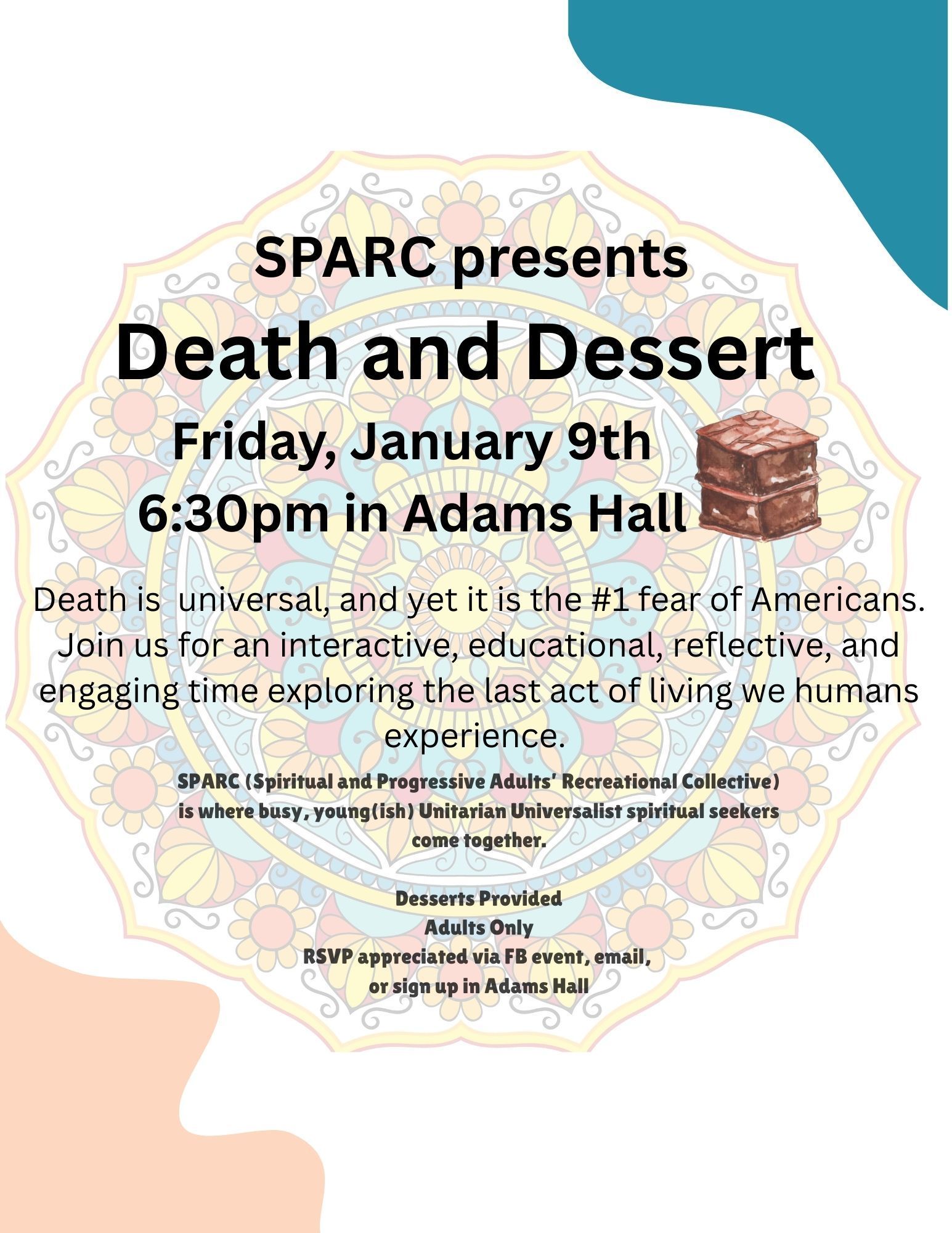 SPARC (Spiritual and Progressive Adults’ Recreational Collective) is where busy, young(ish) Unitarian Universalist spiritual seekers come together for good vibes once a month. Join us for captivating conversations about spirituality, ethics, and social justice, mixed with laid-back banter and chats about local goings-on, all while exploring new, enriching activities together.